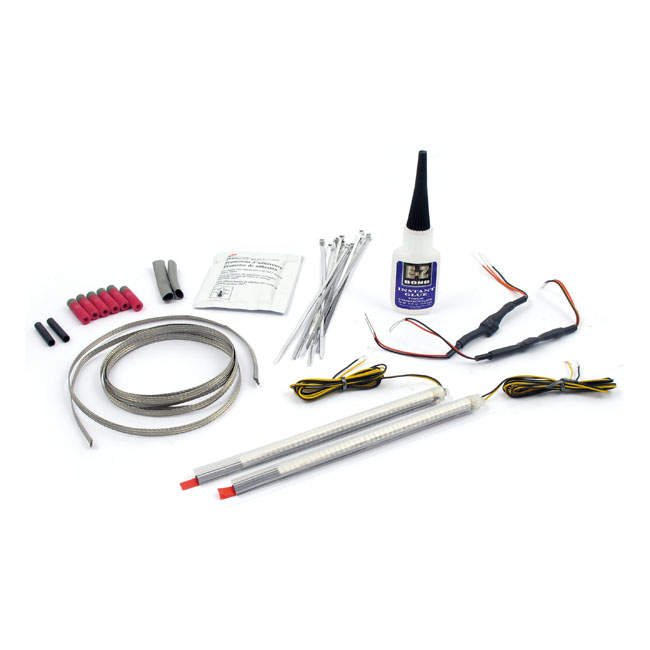 TruWRAPZ® wrap around your fork legs. Installs in 30 minutes with 3M tape. Comes with dual intensity Genesis® LEDs for dual run-turn signal function. Works with hazard lights and alarms when bike is on or off. Includes Posi-Taps, for a tap-in wire application or solder connector with adhesive lined heat shrink tubing, stainless steel wire loom and chrome tie-wraps. – Amber LEDs. – Clear tube.